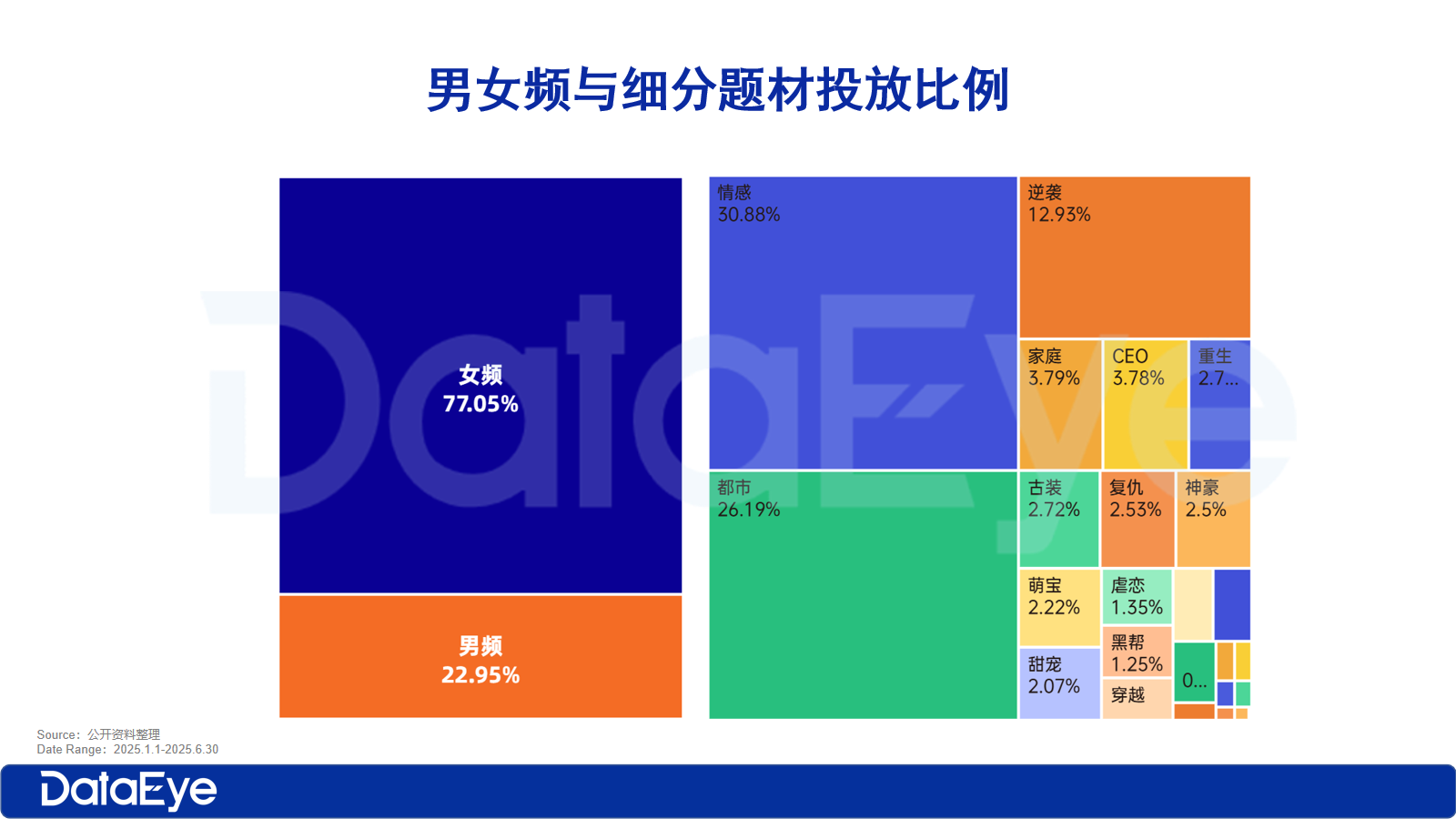数据显示,2025年上半年海外微短剧市场中,情感、都市、逆袭三类题材热度最高,占比达70%。具体来看,北美观众偏好CEO、狼人、甜宠题材,东南亚市场则更关注真假千金、重启人生等元素。