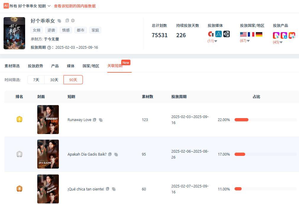 短剧《好一个乖乖女》在创作初期就预留了多语言适配的空间,并提前与海外发行平台协同规划。该剧在国内上线后迅速推出泰语、日语、韩语等版本,截至目前已在海外持续投放226天,累计热度突破千万。
