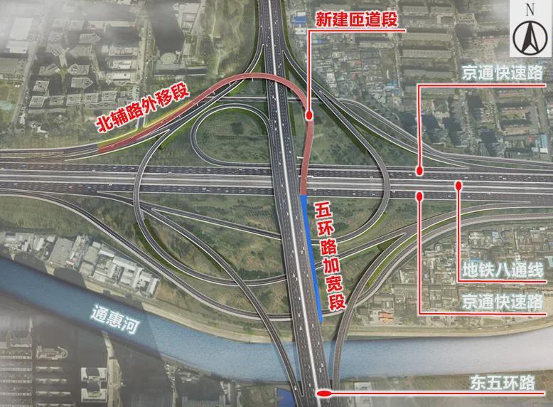 本次改造工程将新增一条由南向西的匝道,同时外移京通快速路北辅路,使东五环外环主路与京通快速进京方向主路相连。匝道全长约870米,建成后将实现东南五环至京通快速路的直接连通。