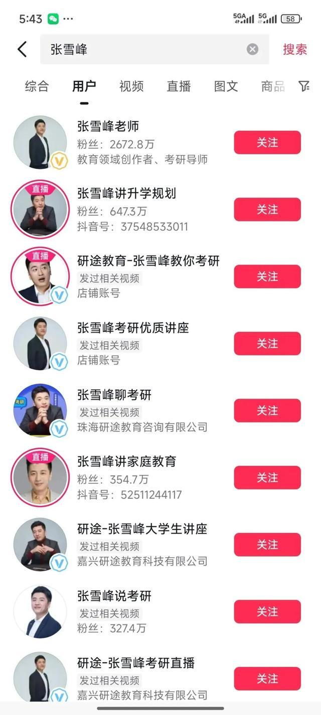 2025年9月24日,有媒体发现知名教育博主张雪峰在微博、小红书、抖音和B站平台的个人账号均被设置为禁止关注状态。不过,抖音平台上以“张雪峰讲升学规划”“张雪峰聊考研”“张雪峰说考研”等名称命名的关联账号目前仍可正常关注,且多个账号正在进行直播活动。