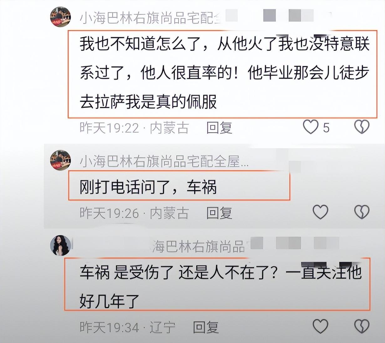 赤峰一位博主透露:“刚打电话问了,是车祸。”这位博主可能是敖其尔的同学,他回忆起当年敖其尔毕业后徒步去拉萨的壮举,字里行间充满了不敢相信的难受。
