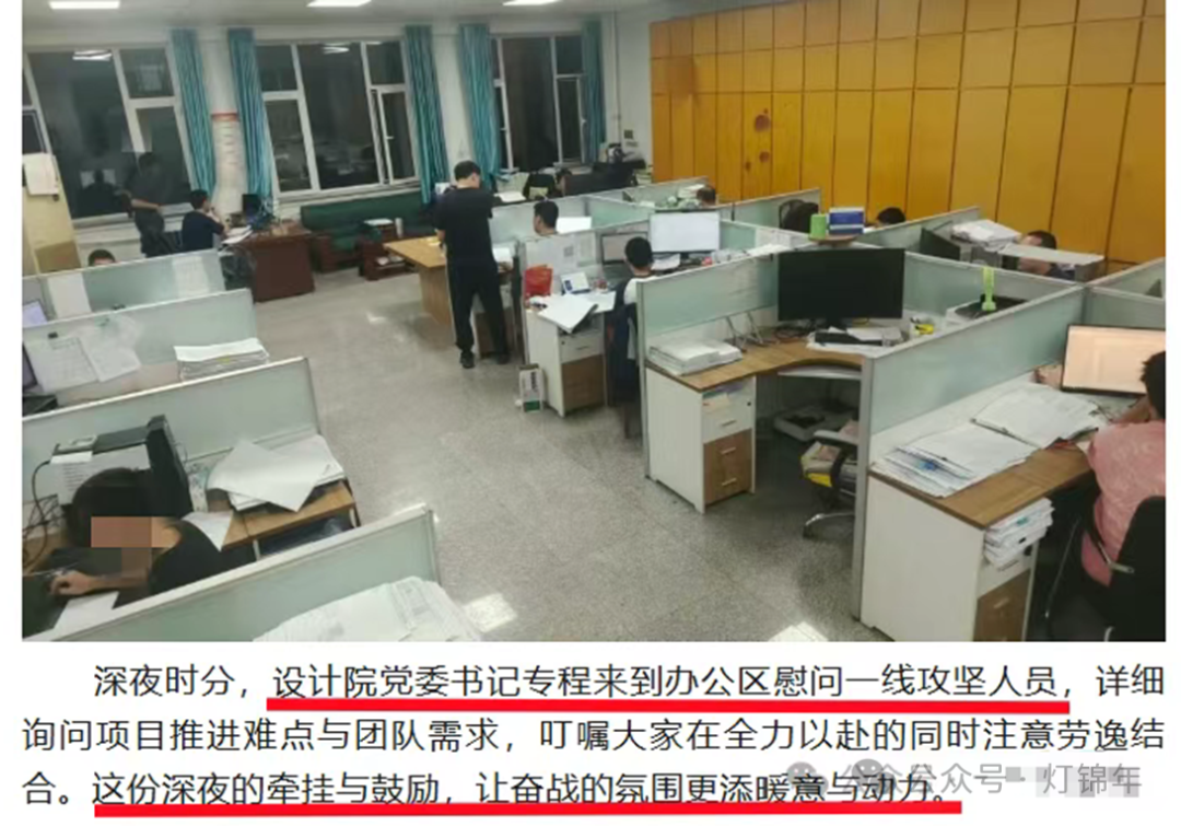据了解,当晚23点27分,这篇“佳作”才姗姗来迟,看来该院的小编也是加班到深夜啊。而该院的设计分院办公区更是灯火通明,设计师们鏖战通宵,就连院书记也亲临现场,慰问一线加班人员,并提醒大家注意劳逸结合。