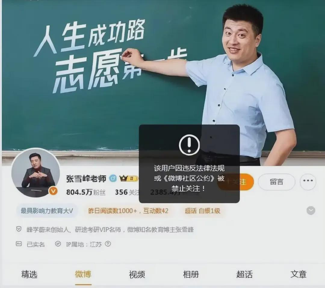 【张雪峰多个账号被禁止关注,工作室:正在反省】据了解,张雪峰账号在微博、小红书、抖音和B站平台均被禁止关注。公开资料显示,张雪峰,研途考研名师,本科毕业于郑州大学,2016年凭借《七分钟解读34所985高校》走红网络,曾多次参与综艺、影视节目。就此,张雪峰工作室工作人员回复“正在反省”。目前,抖音平台上如“张雪峰讲升学规划”、“张雪峰聊考研”等账号仍可关注,且多个账号正在直播。(澎湃新闻)