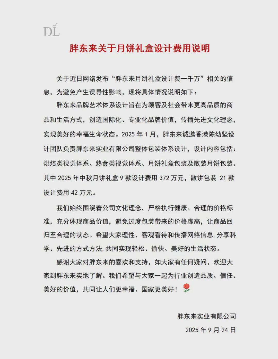 【胖东来否认月饼礼盒设计费一千万】9月24日晚间,针对“胖东来月饼礼盒设计费一千万”相关信息,胖东来发布具体情况说明:2025年1月,胖东来诚邀香港陈幼坚设计团队负责胖东来实业有限公司整体包装体系设计,设计内容包括:烘焙类视觉体系、熟食类视觉体系、月饼礼盒包装及散装月饼包装。其中2025年中秋月饼礼盒9款设计费用372万元,散饼包装21款设计费用42万元。胖东来方面表示,始终围绕着公司文化理念,严格执行健康、合理的价格标准,充分体现商品价值,避免过度包装带来的价格虚高,让商品回归至合理的状态。(界面新闻)