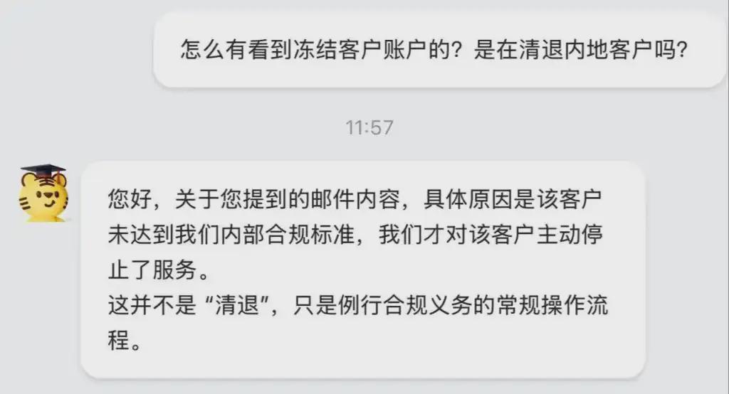 【老虎证券回应“清退内地账户”传闻:属例行合规流程,非针对性清退】近日,有关老虎证券冻结客户账户、限制买入及入金(可平仓提款)的邮件截图,再次引发“清退内地客户账户”的猜测。对此,老虎证券客服回应称,并非清退内地客户账户。因合规原因,公司会定期审核客户账户,需部分客户补充资料(会发送合规问询邮件);若客户未在有效期内补充资料,或补充资料不符合合规要求,账户会被限制交易,此为履行例行合规义务的常规流程。(财联社)