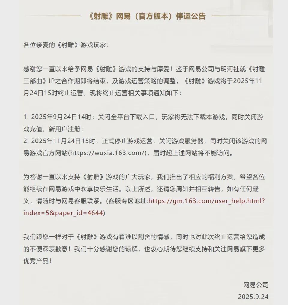 【网易回应《射雕》停运】9月24日,《射雕》网易(官方版本)发布停运公告:鉴于网易公司与明河社就《射雕三部曲》IP之合作期即将结束,及游戏运营策略的调整,《射雕》游戏将于2025年11月24日15时终止运营。公告中还提到:我们跟您一样对于《射雕》游戏有着难以割舍的情感,同时也对此次终止运营给您造成的不便深表歉意。(杭州日报)