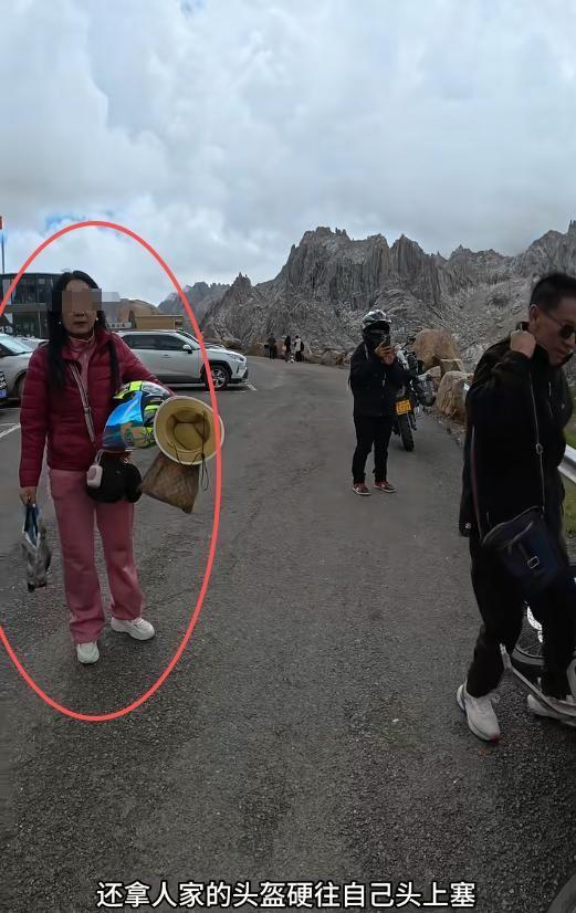 说着,大妈抬腿跨上摩托车,另一位大叔还顺手摘下车主头盔强行戴在她头上。“小哪吒”见状赶紧劝阻,称“这是别人的车,弄坏了赔不起”,但大叔不耐烦地回怼“别多管闲事”。意外很快发生,大妈刚下车,摩托车便侧翻在地,重重撞上路边石头,头盔也滚下山坡。