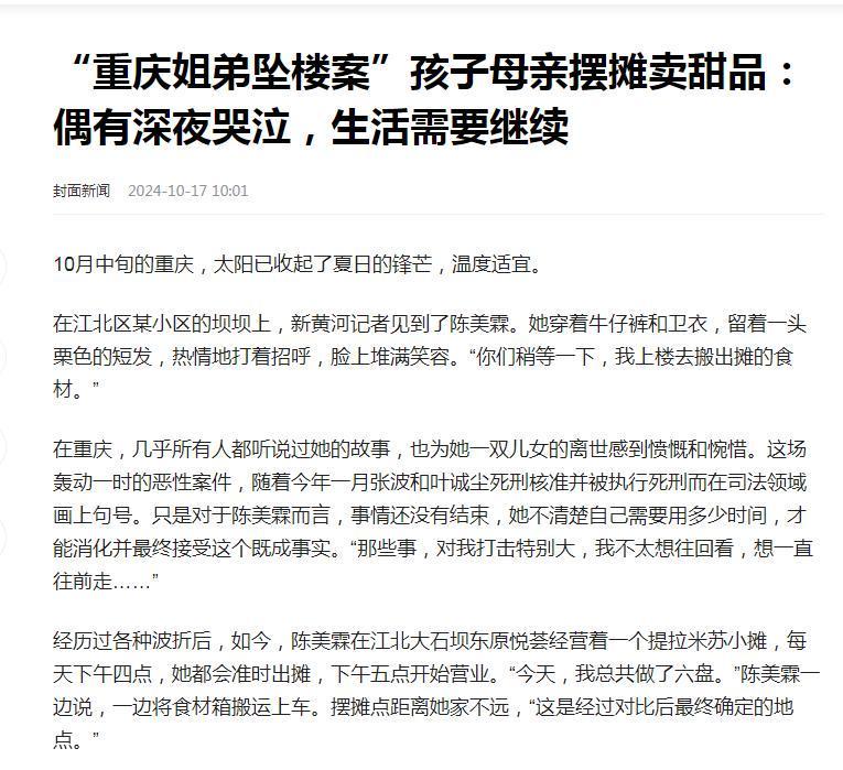 信息来源:封面新闻 2024年10月17日 关于《“重庆姐弟坠楼案”孩子母亲摆摊卖甜品:偶有深夜哭泣,生活需要继续》的报道