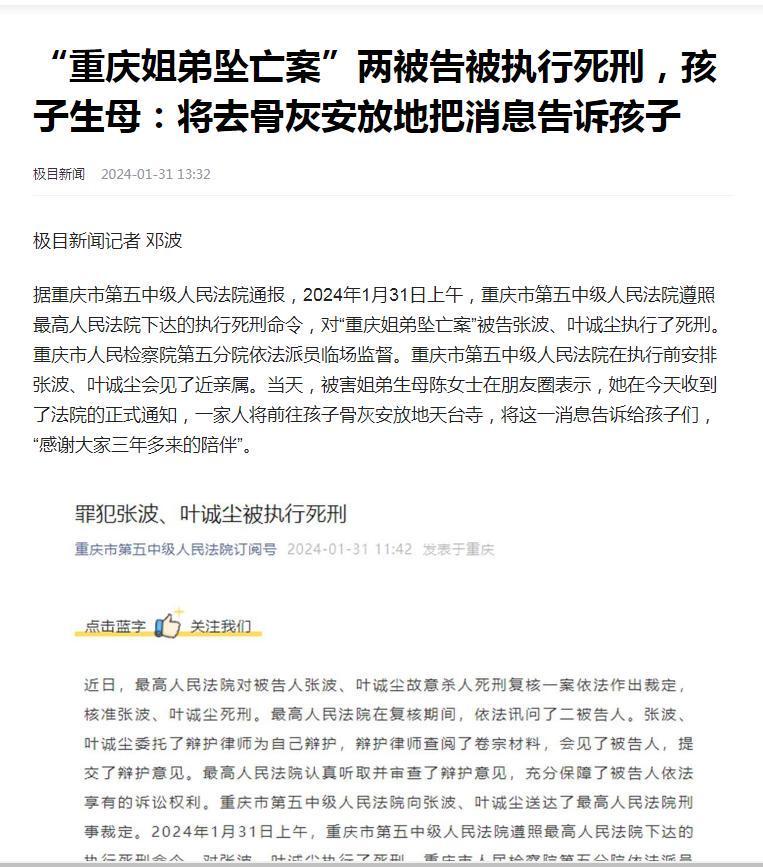 极目新闻 2024年1月31日 关于《重庆姐弟坠亡案”两被告被执行死刑,孩子生母:将去骨灰安放地把消息告诉孩子》的报道