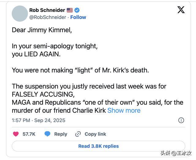 社交媒体上,保守派意见领袖与媒体评论员集体发声要求坎摩尔道歉。压力之下,迪士尼选择停播节目“降温”,此举在美国深夜秀历史上极为罕见。然而暂停期未能平息愤怒,坎摩尔复播后的“澄清”反而激化矛盾。柯克密友、节目制作人安德鲁·科尔维特直言回应“远远不够”,甚至提供“标准道歉版本”:“我错误指控枪手为MAGA支持者,实为左翼人士。向柯克家人道歉,我会做得更好。”