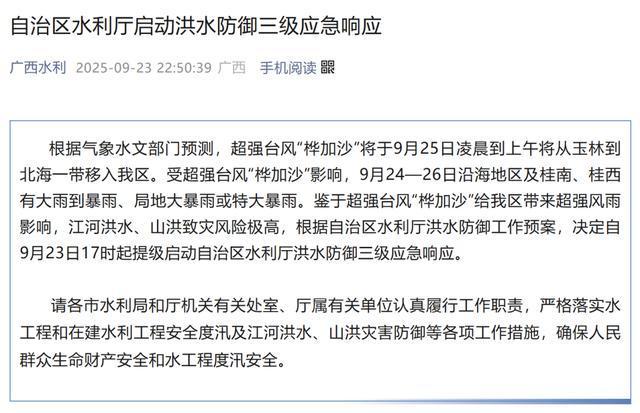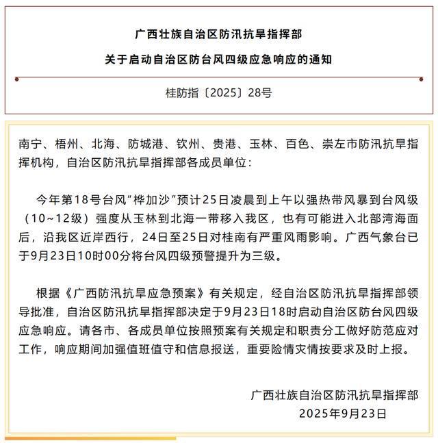 广西启动防台风四级应急响应,并启动洪水防御三级应急响应。