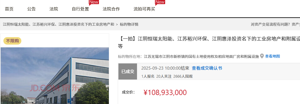 9月23日,江苏江阴市司法拍卖市场迎来一宗备受瞩目的工业资产交易——由江阴恒瑞太阳能、江苏裕兴环保、江阴惠泽投资三家企业共同持有的大型工厂整体打包拍卖,最终以1.0893亿元成交。此次拍卖的标的物包含四宗工业用地及附属建筑设施,总面积达235.6亩,标志着江阴市新桥镇一宗重要工业资产完成产权转移。