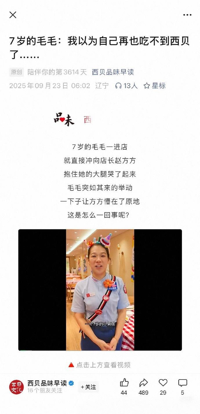 9月23日,内蒙古西贝餐饮集团有限公司旗下的“西贝品味早读”公众号发布了一篇题为《7岁的毛毛:我以为我再也吃不到西贝了》的文章,引发了广泛关注。