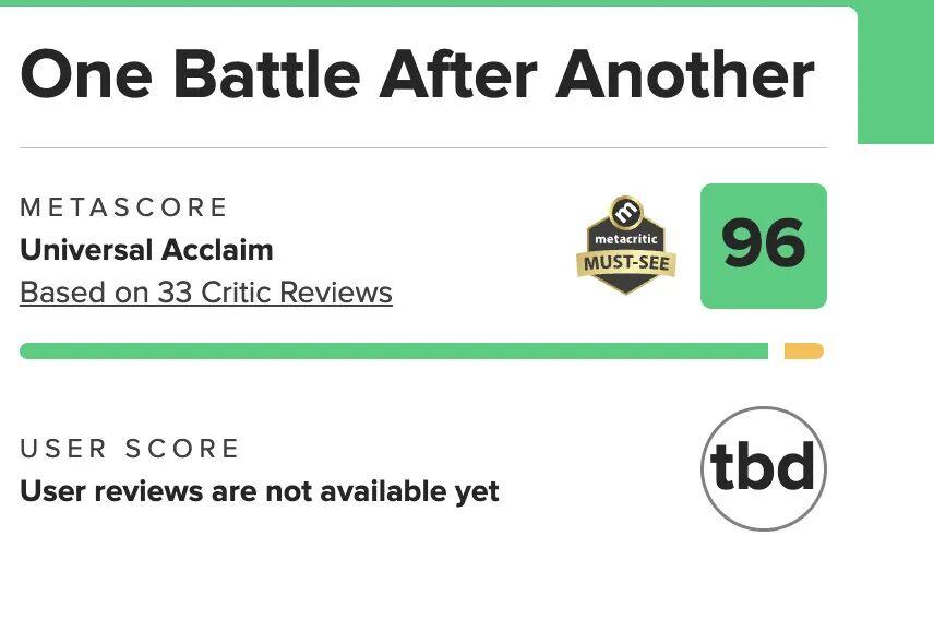 此前,《一战再战》已率先在海外多地首映,并收获了全球主流媒体的集体盛赞。海外平台MTC评分高达96分、烂番茄新鲜度98%,多达21家海外电影媒体给出满分,一举创下今年电影综合评分最高纪录,也是十年来口碑最好的电影之一。