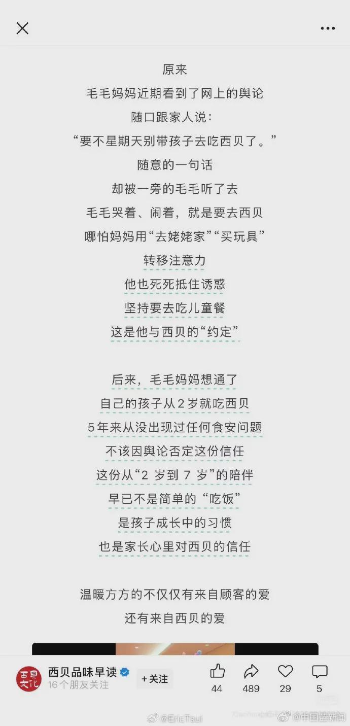 据记者了解,文章以7岁儿童毛毛的视角展开叙述,讲述了毛毛从2岁起便开始光顾西贝,与西贝结下了不解之缘。然而,近期由于一些新闻的影响,毛毛的妈妈开始阻止毛毛再去西贝。毛毛为此哭闹不止,甚至在妈妈用玩具“诱惑”的情况下,也坚决要遵守与西贝的“约定”。最终,妈妈被毛毛的坚持所打动,想通了此事。