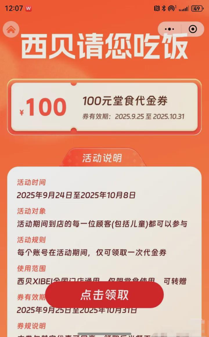 面对网友的质疑与批评,西贝并未选择沉默。9月24日,西贝在线下门店发起了“西贝请您吃饭”活动,向在店消费的顾客免费发放100元堂食代金券。该代金券在西贝全国门店通用,但仅限堂食使用。