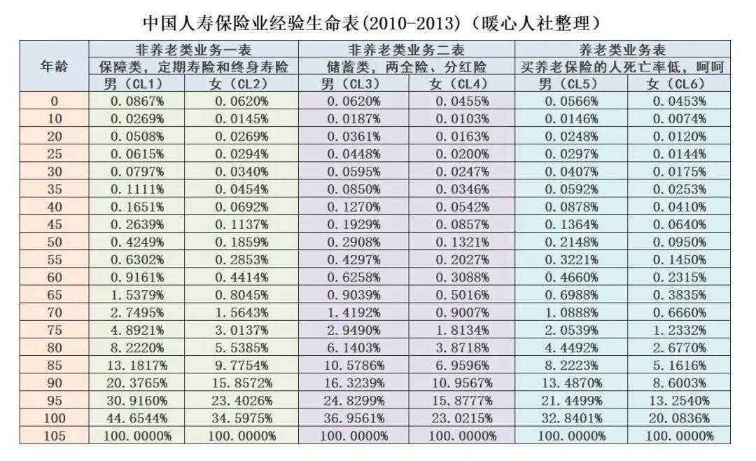 以中国人寿保险业经验生命表为例,该表明确列举了不同年龄段人口的死亡率。数据显示,人们死亡率最低的年龄阶段实际上是10~20岁。此外,参加养老保险的人群死亡率相对较低,这主要是因为人们有了更多的积蓄后,会更倾向于采取措施延长寿命。相比之下,参加意外保险的人群死亡率则相对较高。
