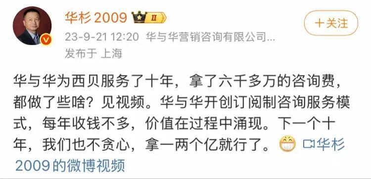 这思路,让客户愿意掏钱。西贝十年给了6000万咨询费,相当于每年600万‘包年服务’——这价格,在广告圈堪称‘顶配中的顶配’。可人家不招客户,客户排队送钱。想见华杉?先签合同,再约时间。这哪是乙方?简直是‘品牌界私立医院专家号’。
