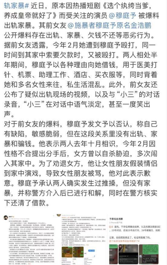 穆庭予以前就是长剧里的龙套演员金浩鹏,改个名字、整个医美、再靠滤镜一包装,居然就成了“短剧新贵”。然而,镜头前越是“深情专一”,镜头后可能越乱。穆庭予在剧里演逆袭明君,戏外却被前女友王小姐锤“家暴、出轨、骗钱”。