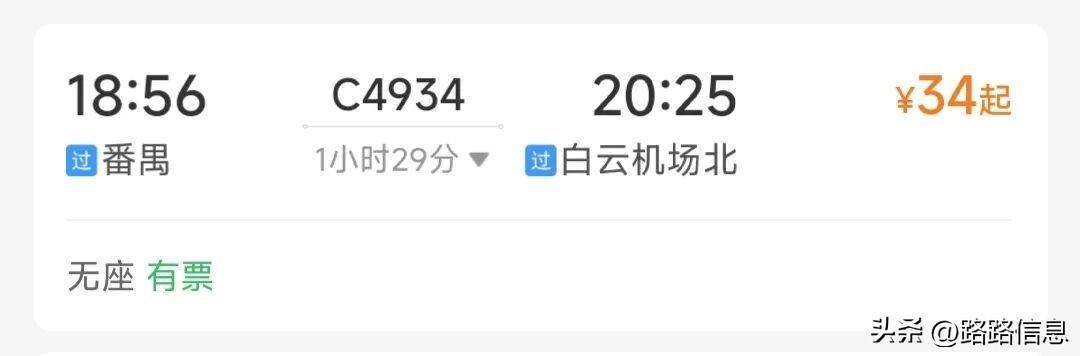 备受关注的广州东环城际白云机场北至番禺段票价终于揭晓。根据12306显示,C4934次列车将于18点56分从番禺站发车,20点25分抵达白云机场北站,全程运行89分钟,票价定为34元。
