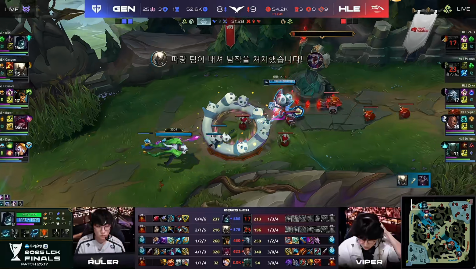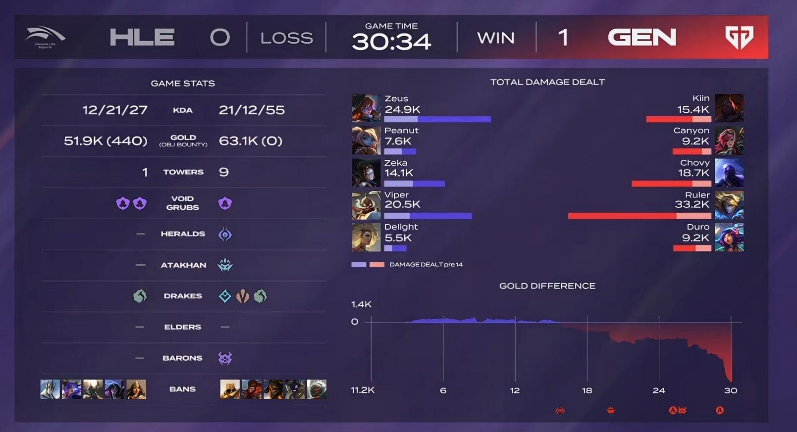 第二局HLE换上兰博+巨魔的上野组合,GEN则拿出格温+赵信应对。对线期GEN上野完成极限2V2反杀,但HLE通过推掉两座防御塔稳住局势。中期厄塔汗争夺战成为转折点,Duro洛先手开团失误后,Zeka阿卡丽进场未能秒杀Ruler卡莎,反而被GEN反打完成1换5。31分钟Zeka绕后再次被秒,GEN顺势拿下大龙。38分钟小龙团战,Ruler卡莎以7-0-4的完美数据收割战场,GEN打出1换5后锁定胜局。