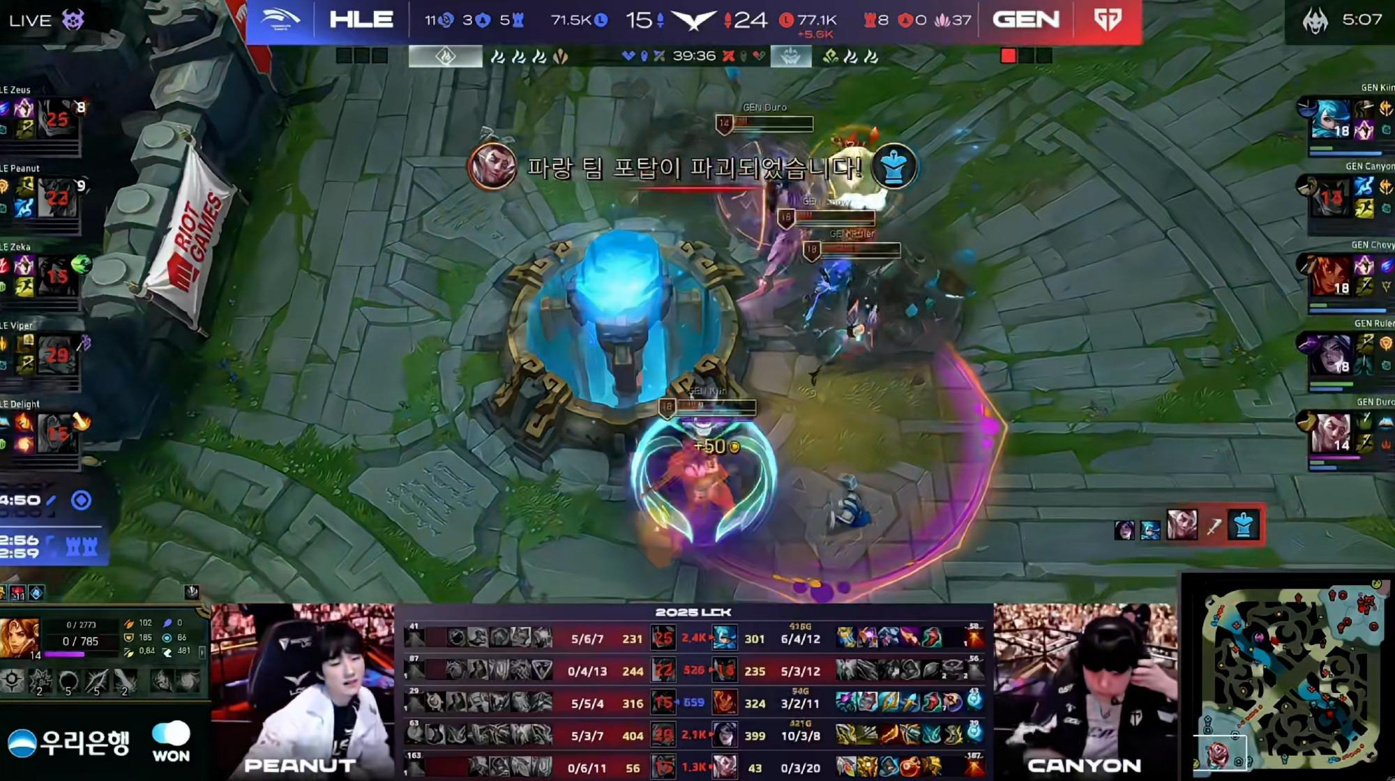 第四局GEN祭出掘墓+潘森的非常规组合,HLE则以奥恩+蝎子应对。对线期双方经济持平,但中期Duro机器人精准钩中Zeus奥恩,GEN顺势拿下小龙和厄塔汗。31分钟大龙团战,Zeus奥恩率先被秒,GEN完成0换2后拿下大龙。37分钟HLE抓死Kiin掘墓后强行打龙,Canyon潘森进场开团瞬间,Zeka维克托再次被秒,Ruler霞斩获双杀后拿下第二条大龙。最终41分钟Peanut蝎子开团失误,GEN反打击杀HLE四人后结束比赛。