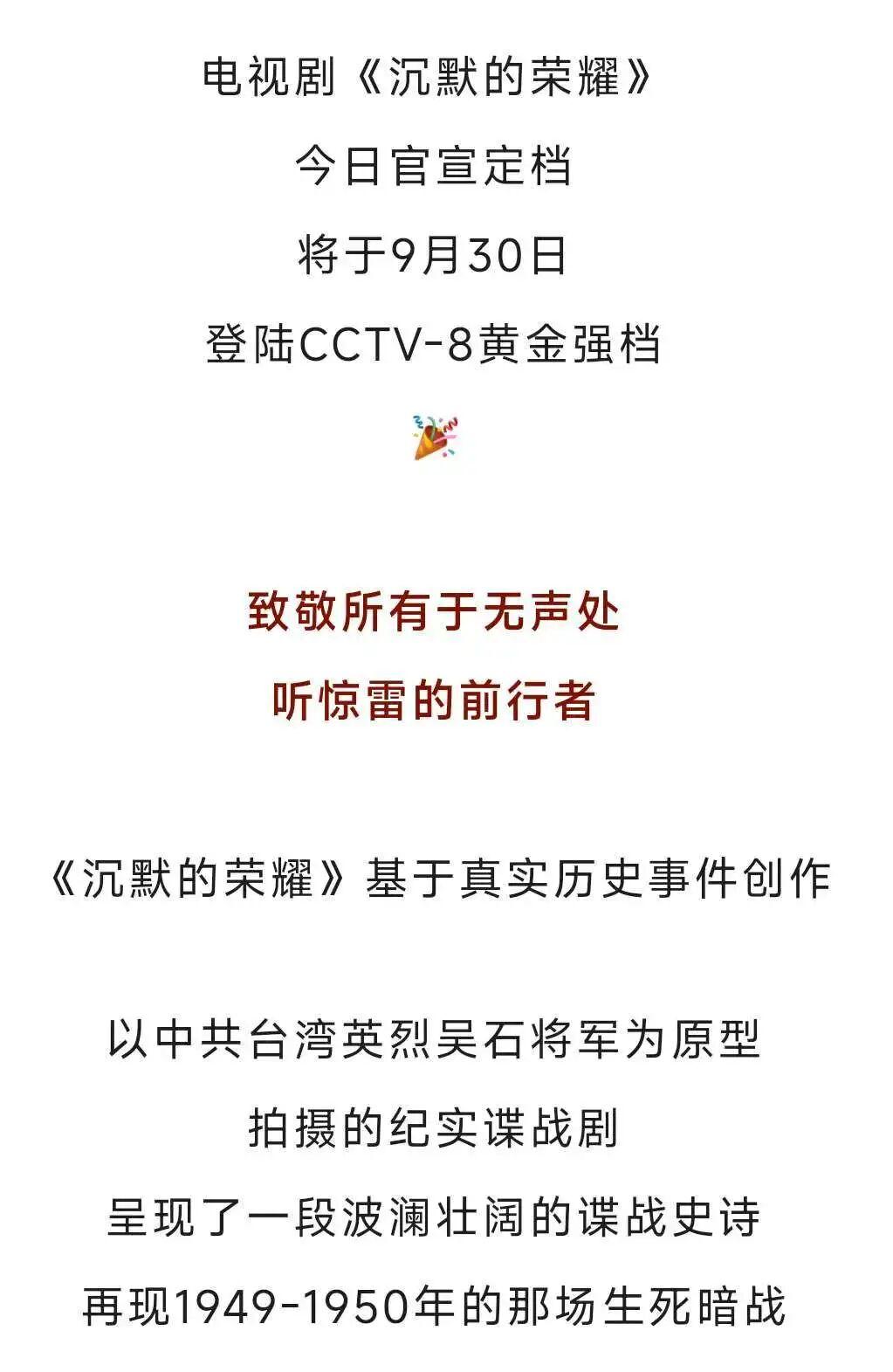 9月30日晚,当夜幕降临,华灯初上,请锁定CCTV-8黄金强档,与《沉默的荣耀》一起,穿越时空,感受那份沉甸甸的信仰与荣光。