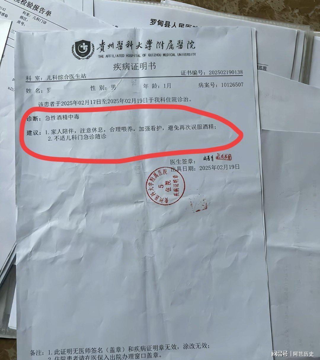 诊断书上明确写着是酒精中毒,医生建议家人多陪伴孩子,注意休息,合理喂养,并提醒不要再误食酒精。如今,孩子已经9个月大了,非常健康。