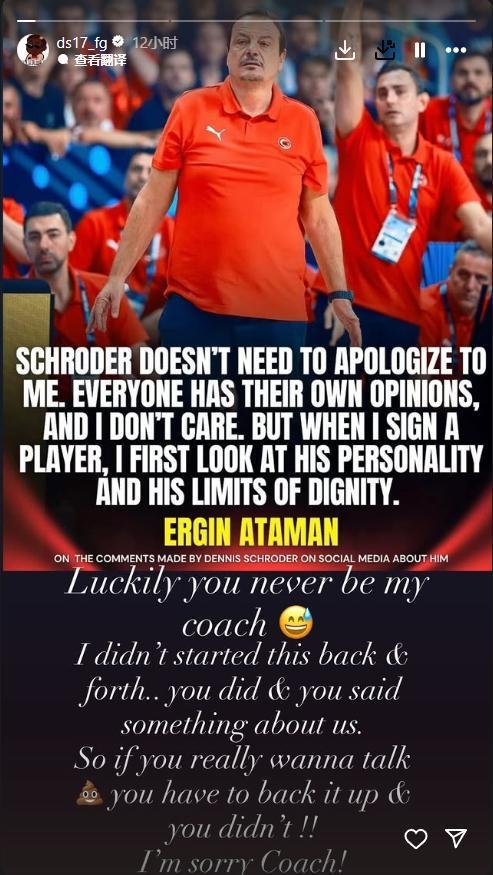 近日,施罗德在个人社交媒体上再次对阿塔曼的言论做出了回应。他直言不讳地表示:“幸好你从未成为我的教练。这场纷争根本不是我挑起的,而是你。是你先发表了那些关于我们的不当言论,所以如果你真想谈这些事情,你得拿出证据来证明你的观点,但你并没有!!我很抱歉,教练!”
