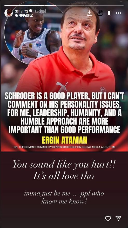 此前,施罗德就曾对阿塔曼当选最佳教练表示过不满,他直言:“最佳教练?开什么玩笑!”而阿塔曼在谈及施罗德的言论时,也表达了自己的看法:“他是好球员,但领导力与谦逊比表现更重要。”
