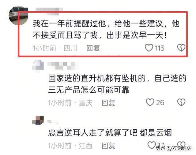 如果他肯听妻子、家人、网友的劝,如果在被拒绝后能放弃买飞机,如果在两次出事故后能意识到危险停飞,如果他能找专业人士改装飞机、教飞行技巧,这次事故都有可能避免。
