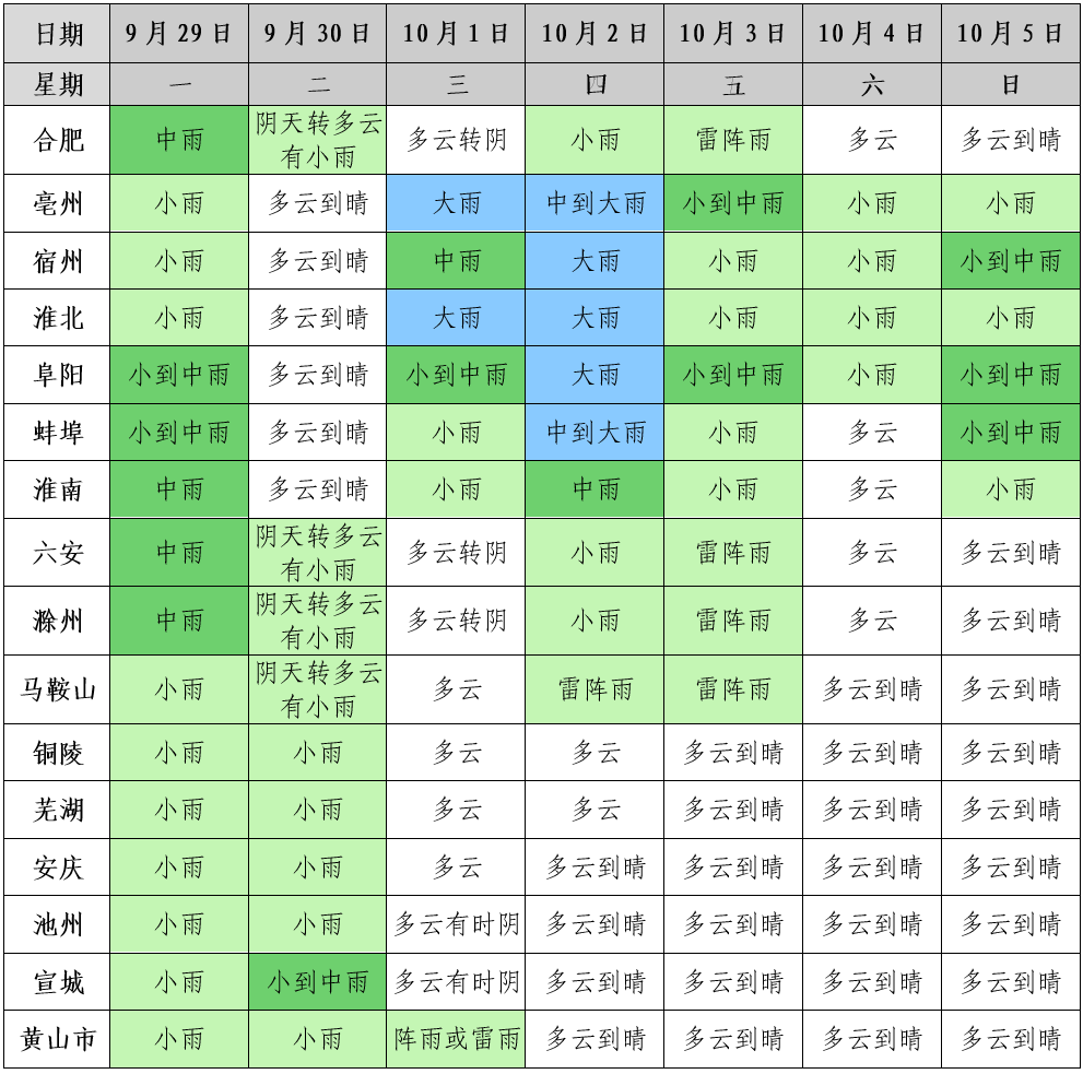 据安徽气象最新消息,国庆假期期间(10月1日至5日),沿淮淮北地区将迎来较明显降水过程。其中,10月1日至2日,部分地区将出现大雨,局部暴雨,并可能伴有短时强降水和雷暴大风等强对流天气。淮河以南地区则以多云到晴天气为主,仅2日至3日江淮之间部分地区有小雨。