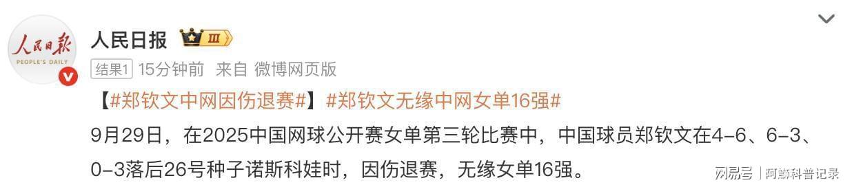 北京时间9月29日晚,中国网球公开赛女单第二轮焦点战打响,中国金花郑钦文迎战捷克选手诺斯科娃。双方在前两盘战成1-1平,进入决胜盘后,当诺斯科娃以3-0领先时,郑钦文突然请求医疗暂停。经场外医生诊断确认,其手肘旧伤复发无法继续比赛,最终含泪退赛,诺斯科娃因此晋级16强。