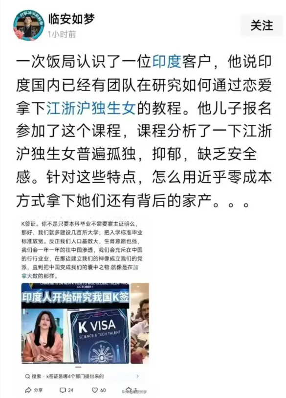 据这位网友透露,他在一次饭局上结识了一位印度客户,该客户透露,在印度已有团队和机构专门研究如何通过恋爱手段接近江浙沪独生女,并为此设置了详细的教程。甚至,该客户的儿子还专门报名参加了这个课程。