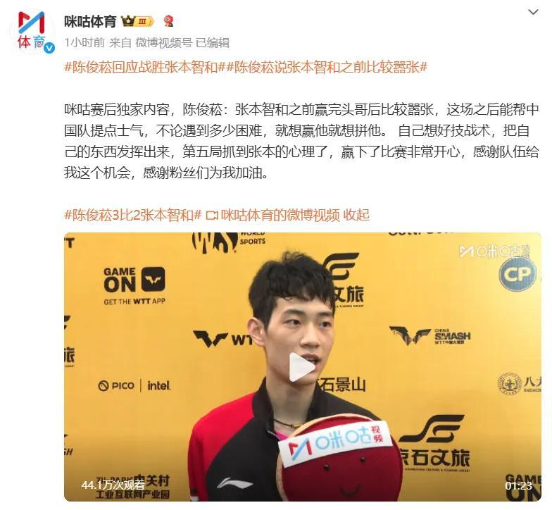 自横滨夺冠后,张本智和在中国选手面前接连受挫。9月11日WTT澳门冠军赛男单首轮,他以0-3(11-8、11-8、11-9)惨败于薛飞。本场中国大满贯赛,陈俊菘的胜利再次印证中国乒乓新生代的崛起。“现场观众的支持给了我巨大力量,主要感谢队里给的机会。”陈俊菘特别提到粉丝助威,并直言赢下比赛的重要意义在于“帮中国队提士气”。