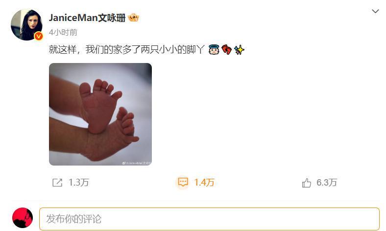 9月30日下午5时20分,文咏珊以诗意文案"我们的家多了两只小小的脚丫"配发新生儿脚丫特写照,正式向公众分享这份喜悦。照片中婴儿的脚丫与温馨文字形成强烈情感共鸣,瞬间引爆社交媒体。