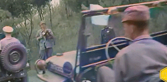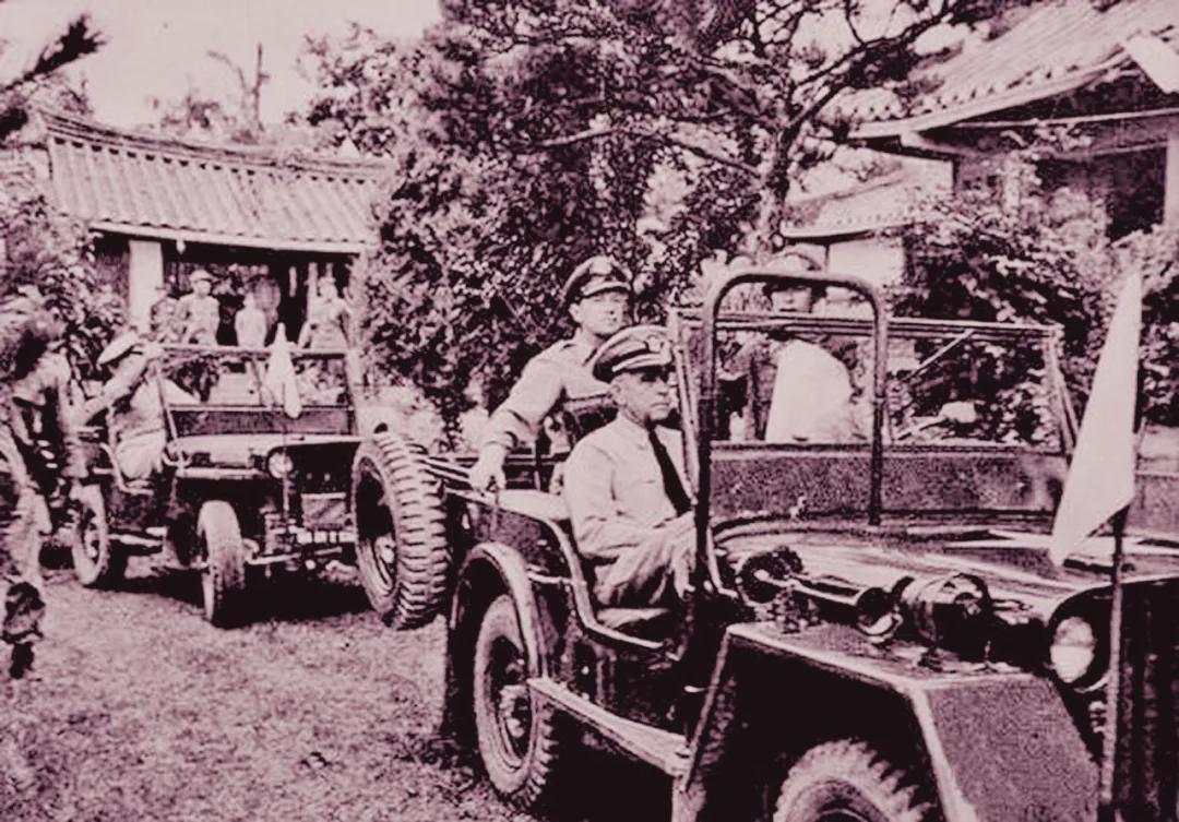 ▲“联军”代表团乘坐插着白旗的汽车来开城谈判,车上坐的是首席代表美国海军中将乔埃。