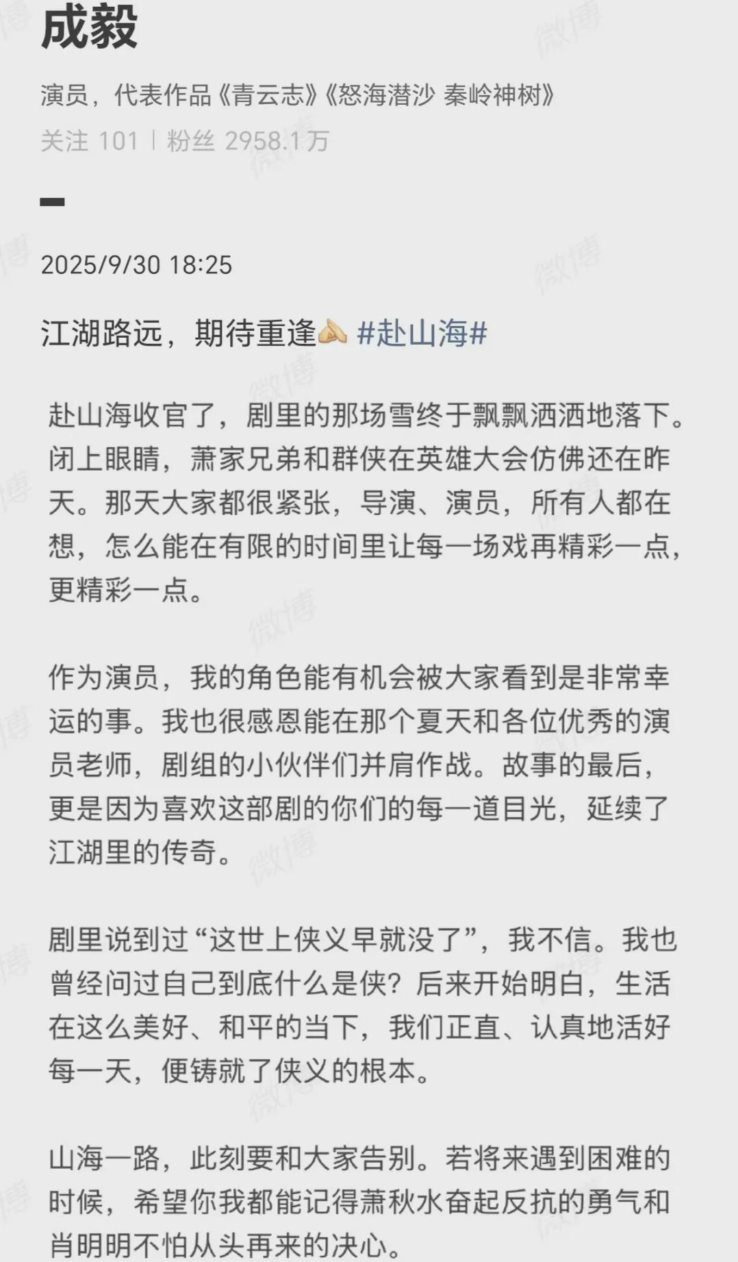 《赴山海》收官之际,成毅发文告别。他表示作为演员,角色能被大家看到非常幸运,并写道:“生活在这么美好、和平的当下,我们正直、认真地活好每一天,便铸就了侠义的根本。”成毅此言,既安慰了沉浸在大结局中的观众,又似乎暗含对萧开雁角色的思考。