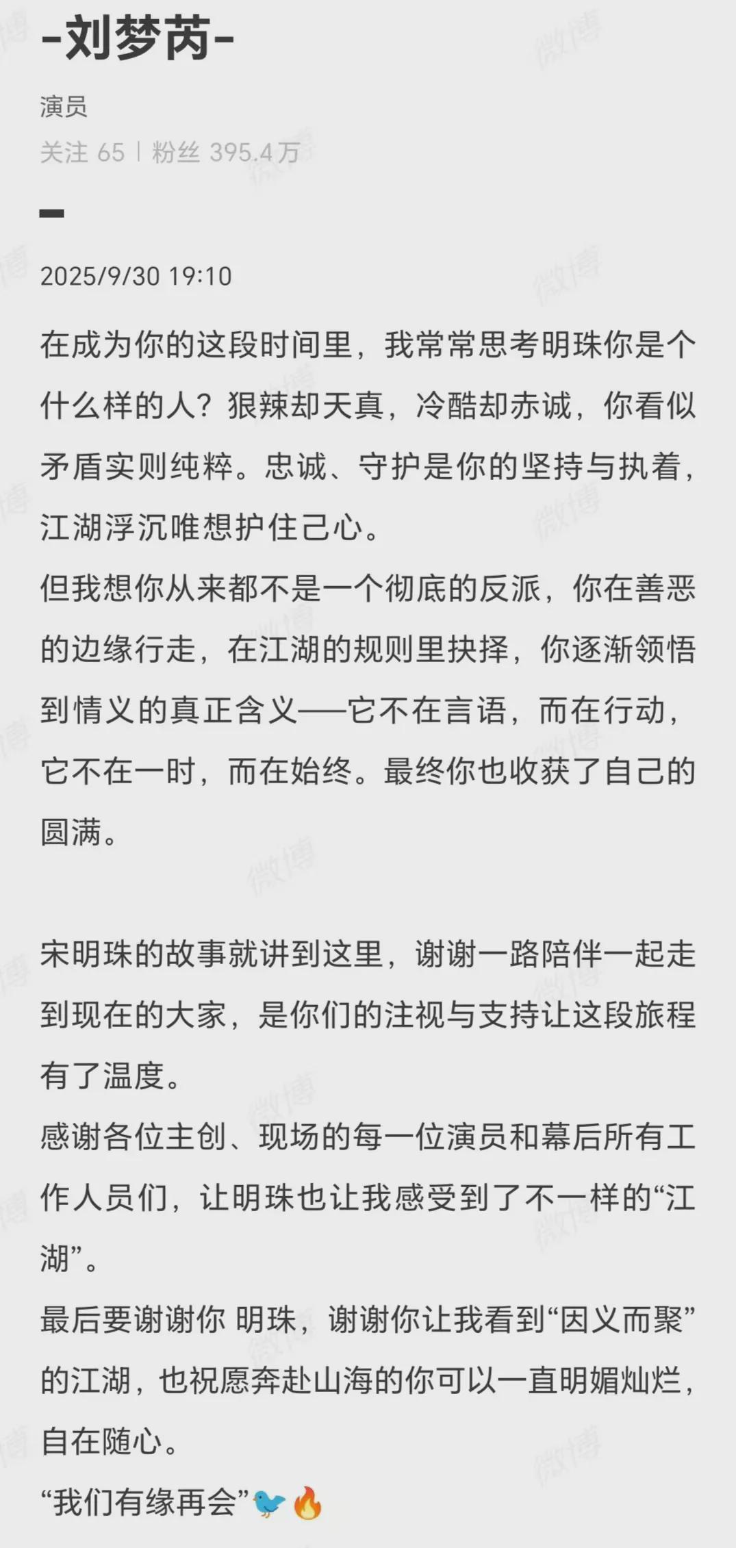 刘梦芮在剧中饰演宋明珠,她在告别文中写道:“你逐渐领悟到情义的真正含义-它不在言语,而在行动,它不在一时,而在始终,最终你也收获了自己的圆满。”这份圆满,正是来自萧秋水的救赎。