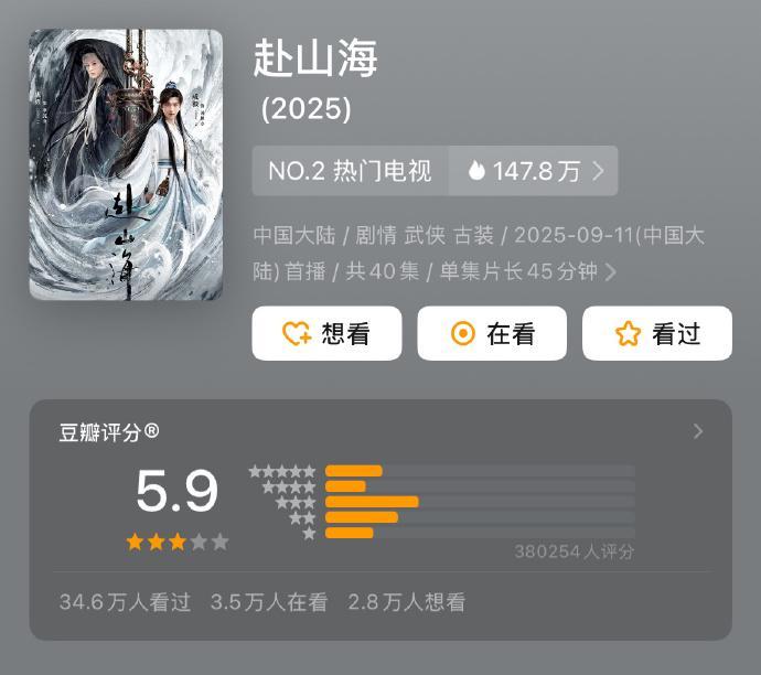 由成毅主演的大男主剧《赴山海》近日开分,最终得分为5.9,这一结果并未引发太大意外。此前,该剧评分迟迟未出,据推测是在平衡恶意刷分的情况。一方面,有黑粉恶意给出一星打压;另一方面,成毅的粉丝则积极给出五星好评进行对冲。如今评分公布,一星与五星点评几乎对半开,一定程度上相互抵消。若除去最高分和最低分的极端点评,仅看中间分数占比,5.9分确实较为真实地反映了这部影视作品处于及格线的水平。
