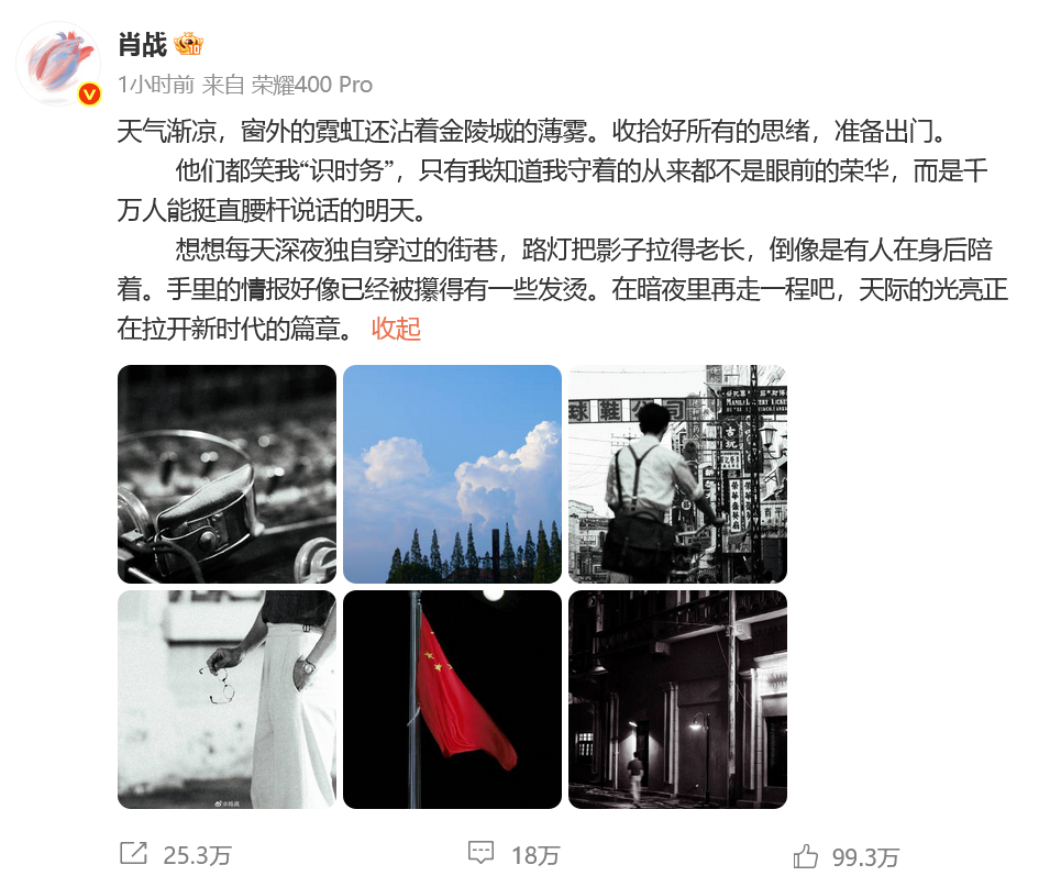 饰演地下党员任少白的肖战发布杀青小作文:“天气渐凉,窗外的霓虹还沾着金陵城的薄雾。收拾好所有的思绪,准备出门。他们都笑我‘识时务’,只有我知道我守着的从来都不是眼前的荣华,而是千万人能挺直腰杆说话的明天。想想每天深夜独自穿过的街巷,路灯把影子拉得老长,倒像是有人在身后陪着。手里的情报好像已经被攥得有一些发烫。在暗夜里再走一程吧,天际的光亮正在拉开新时代的篇章。”