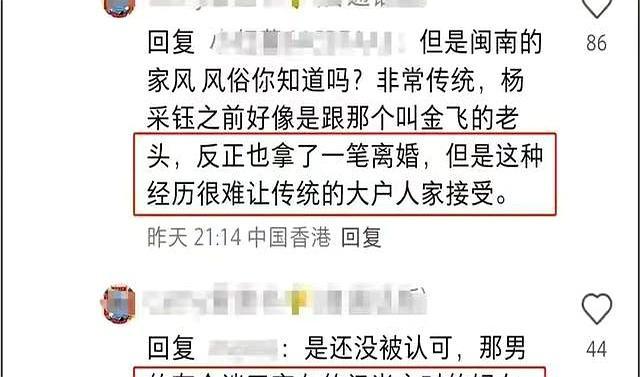原因主要有两点:一是杨采钰过去的感情经历,尤其是她与大30岁的陈金飞的那段关系,在传统观念极强的老钱家族眼中,是一个难以逾越的障碍。他们更希望找到一个背景干净的儿媳妇。