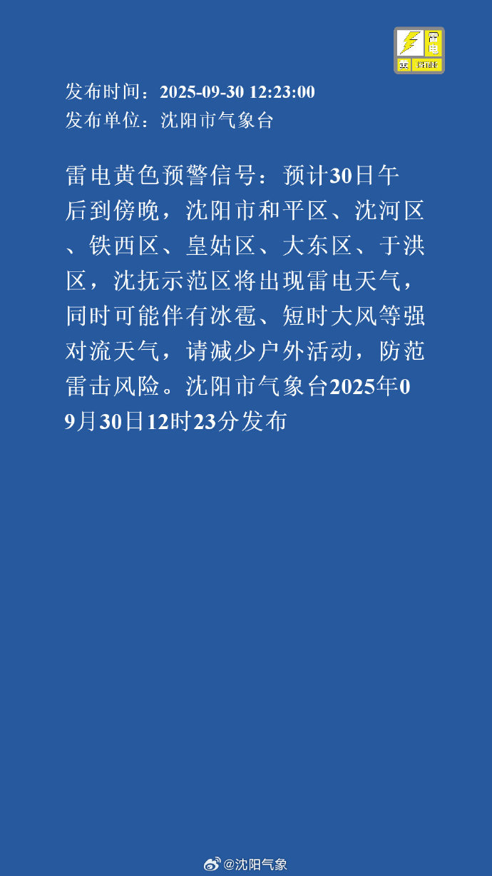 沈阳市气象台于中午12时23分发布了雷电黄色预警信号,预计30日午后至傍晚,沈阳市和平区、沈河区、铁西区、皇姑区、大东区、于洪区及沈抚示范区将出现雷电天气,同时可能伴有冰雹、短时大风等强对流天气。市民应减少户外活动,防范雷击风险。