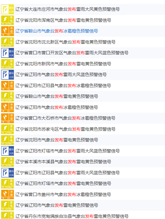 与此同时,辽宁多地也纷纷发布了暴雨、雷雨大风、冰雹等天气预警信号。