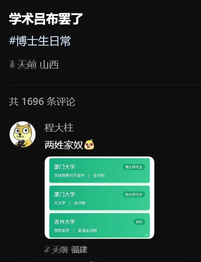 评论区中,另一位学生分享了‘两姓家奴’经历:从吉林大学预防医学跨至厦门大学天文学与天体物理。医学与天文学的跨度,丝毫不逊色于前者的‘三姓家奴’。