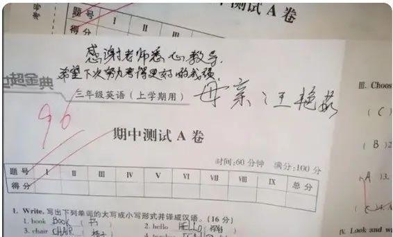 近日,有网友在网上分享了几张家长在试卷上的留言照片,引发了广泛关注。这些留言中,既有对孩子的鼓励和表扬,也有对老师说的话。简单的字眼中,透露出家长的教养和认真态度。