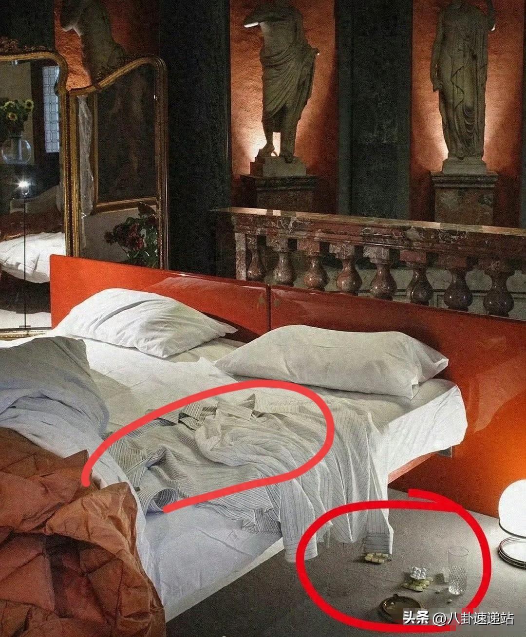 只见照片中,床上赫然摆放着一件男士衬衫,而地板上则有一团看起来像是内裤的布料,旁边还散落着一些药品。这些私人物品的出现,让粉丝们感到十分困惑。