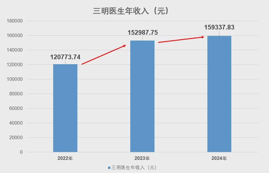 在某公众平台,一位来自三明市一级社区医院的主治医师曝光了自己连续3年的年薪变化(见下图):