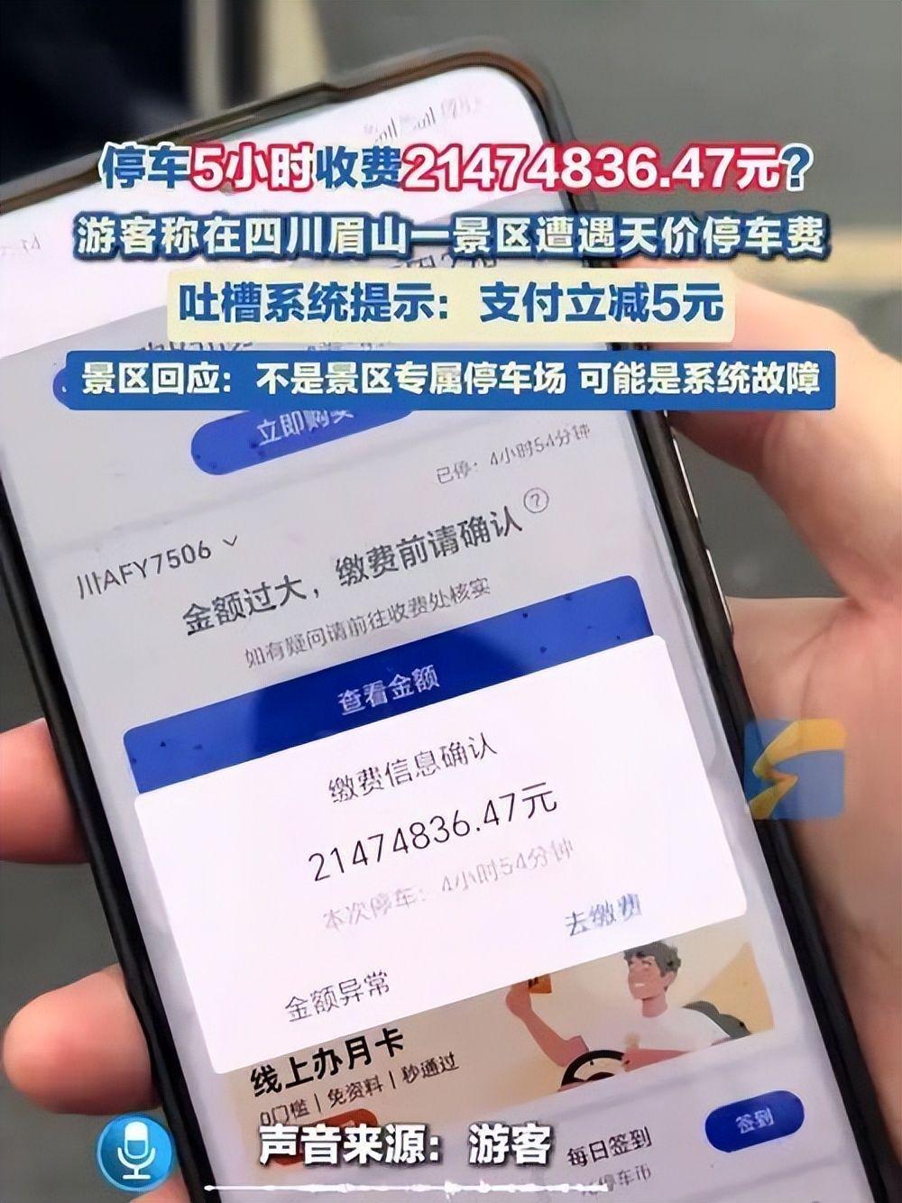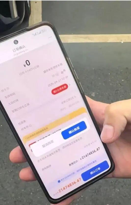 只见,手机系统上显示:“缴费信息确认:21474836.47元,本次停车4小时54分钟。”