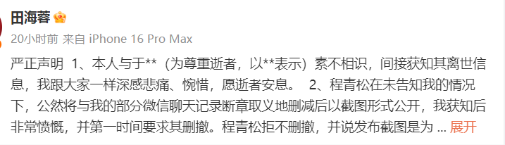 田海蓉强调,自己与于朦胧素不相识,对其离世深表惋惜。程青松的行为不仅侵犯隐私,更导致她及家人遭受大规模网络攻击,包括“田海蓉s人犯”等恶意诽谤。